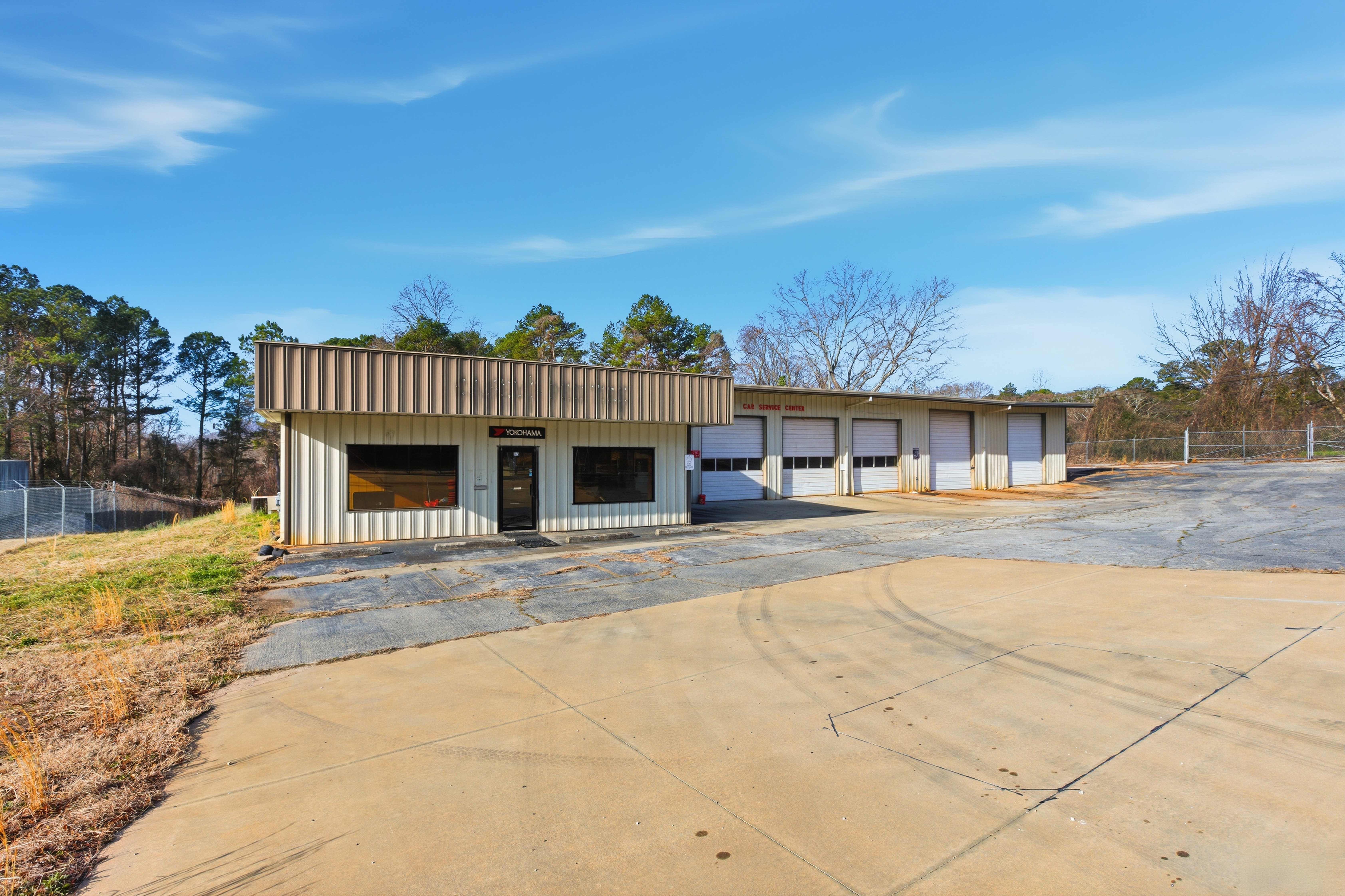The facility includes six expansive bays with roll-up doors and a 16’ eave height, optimized for industrial maintenance and heavy-duty storage.
